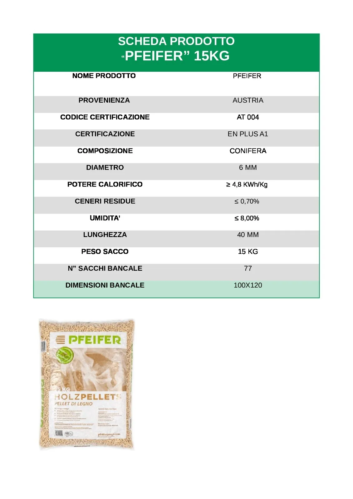 Sacco Pellet PFEIFER HOLZPELLETS da 15 Kg Certificato ENplus Prodotto Naturale di Legno
